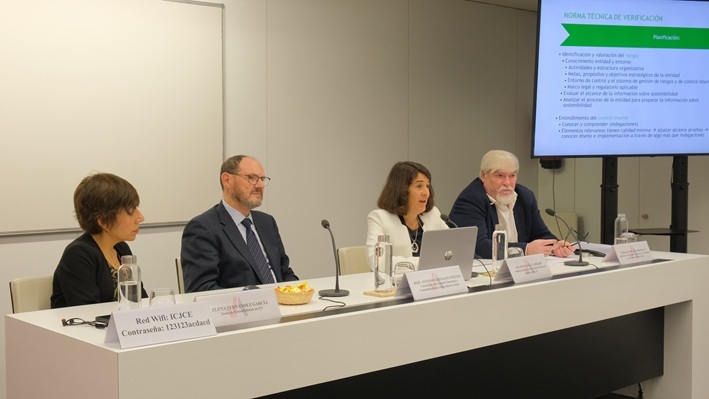 La primera de las mesas titulada: “La Futura Ley de Verificación de la Información sobre Sostenibilidad” tuvo como moderador a Emiliano Ruiz Barbadillo, catedrático de Economía Financiera y Contabilidad de la Universidad de Cádiz. En ella participaron como ponentes Elena Fernández García, socia de Sostenibilidad en EY; José Antonio Gonzalo Angulo, catedrático de Economía Financiera y Contabilidad de la Universidad de Alcalá; y Ana Manzano Cuadrado, subdirectora General de Normas Técnicas de Auditoría del ICAC.
